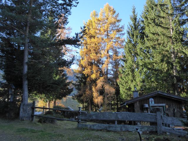 Von dort über die Wiesen hinauf zur Birgitzer Alm. Die war ob des schönen Herbstwetters gut besucht, und von oben und unten trudelten Gäste ein. Ich wanderte weiter Richtung Birgitzköpfelkreuz.