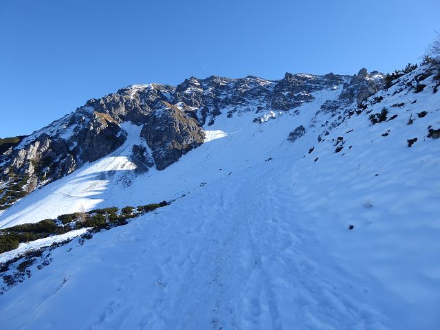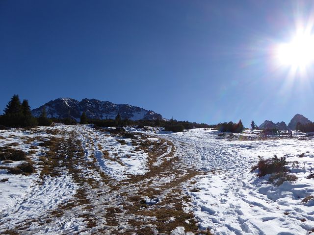 Der Weiterweg führt unterhalb der Nockspitze Richtung Pfriemes- (Wand und Köpfl). Der untere Weg führt fast eben zum wiesigen Mugel, der Ziel bei vielen Schitouren ist. Ob genau dieser Wiesenmugel auch das „Pfriemesköpfl“ ist, weiß ich gar nicht genau.