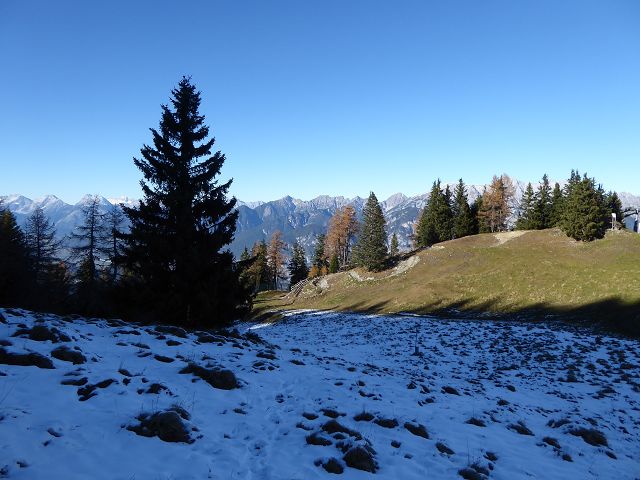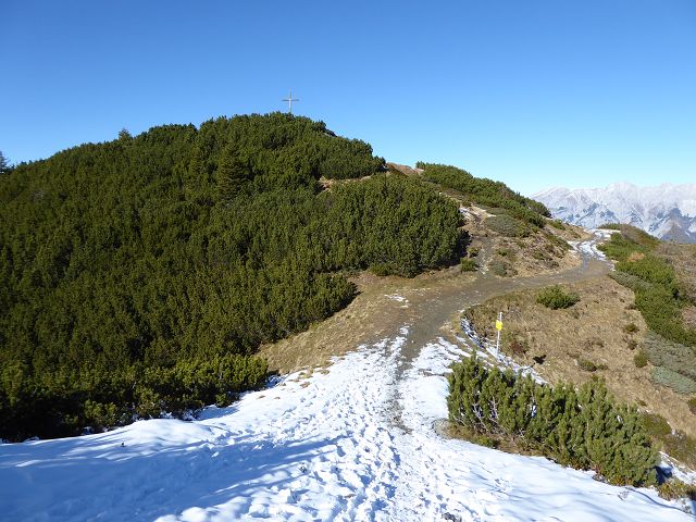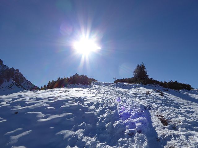 Dieses berührte ich im Vorbeigehen. Das Angreifen eines Gipfelkreuzes, an dem ich nicht lange verweile, wird wohl ein zwanghafter Drang sein :-). Die nächste Station war das Birgitzköpfelhaus. Dort lehnte ich mich am Zaun auf der Sonnenterrasse Richtung Axamer Lizum und inspizierte die Schneeverhältnisse. Nach dem letzten Schneefall waren schon erste Schispuren sichtbar. Mehr zu ersten Tourengehern später.