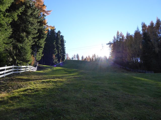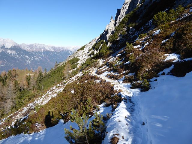 ich könnte auch schreiben: „Birgitzköpfelhaus“. Aber weil bei dieser Runde nicht das Ziel, sondern eben die ganze Runde den Genuss bieten, ist es eben die Hausrunde. Die Rodelbahn ging es – jahreszeitlich bedingt grossteils im Schatten – Richtung Hüttenboden.