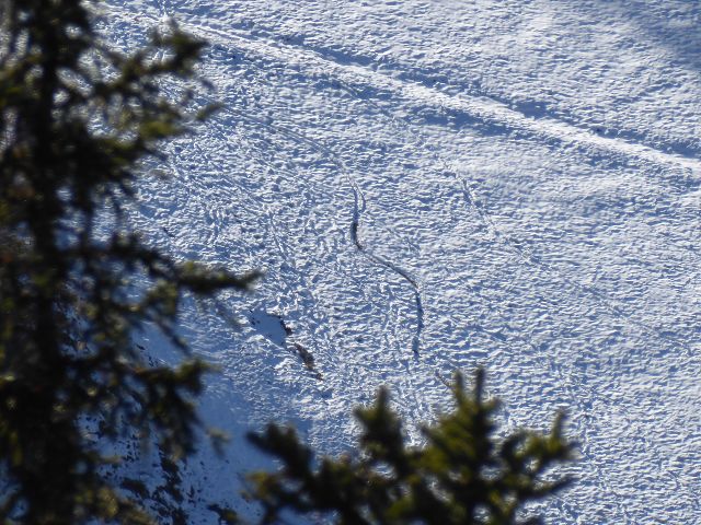 Schöne Schneekristalle und das Gipfelkreuz des Spitzmandl im Zoom. Beim Rasten entdeckte ich dann, auf der Götzner Schiabfahrt verdächtige Spuren. Ich holte mir diese mit einem Foto näher und erkannte noch nichts genaues, das wollte ich danach zuhause nachholen. Das Bild zeigt…..