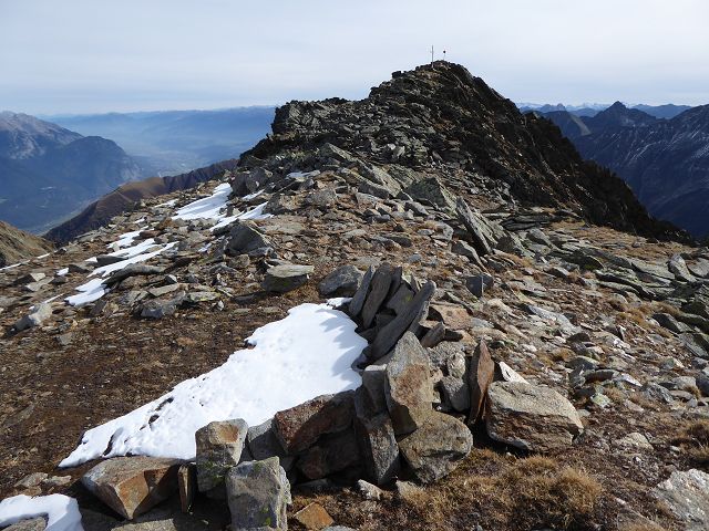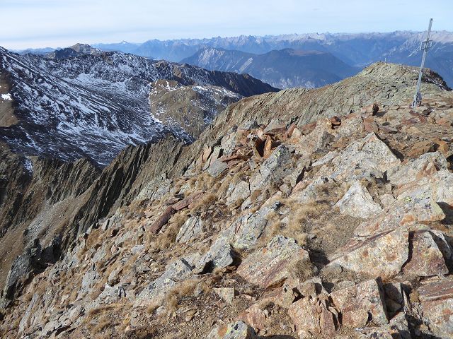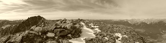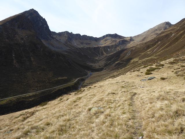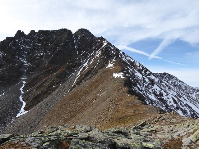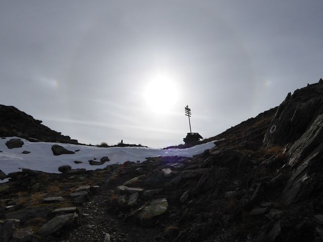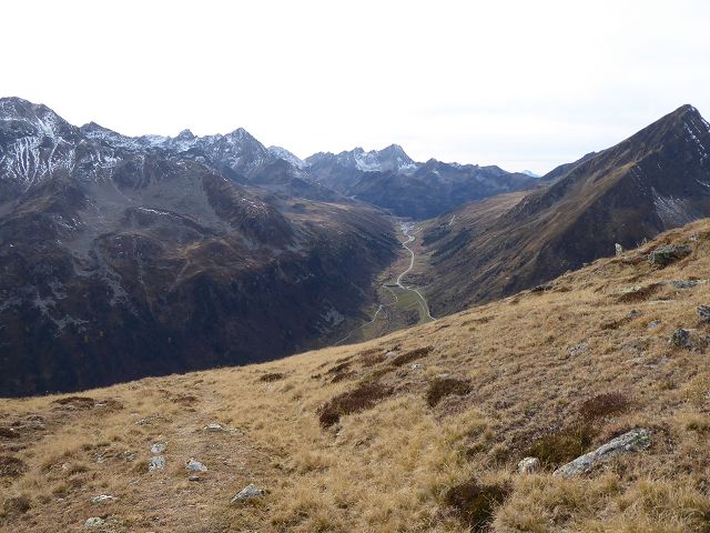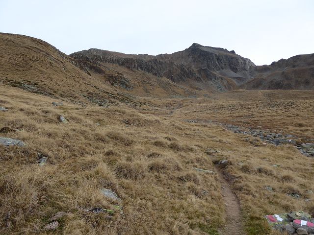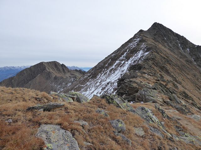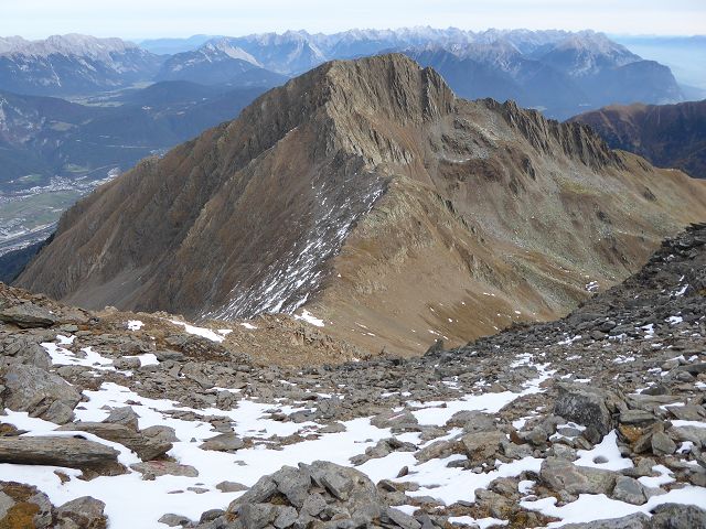 Die Sonne, durch Schleierwolken verdeckt, ließ sich auch mehr und mehr blicken und bescherte neben dem Genuss, die Landschaft für mich alleine zu haben, auch noch wohlige Wärme. Zudem traf ich vom Rietzer Grießkogel bis zur Flaurlinger Scharte auf nicht einen einzigen anderen Wanderer.