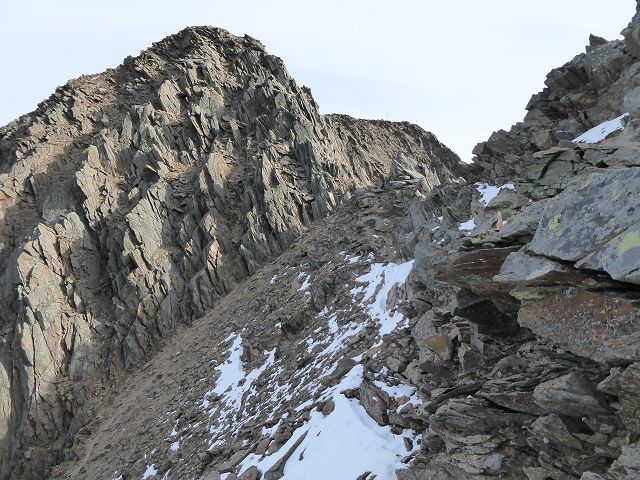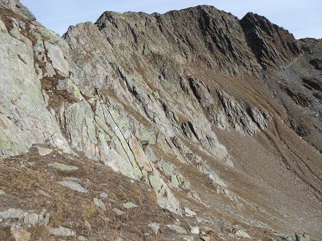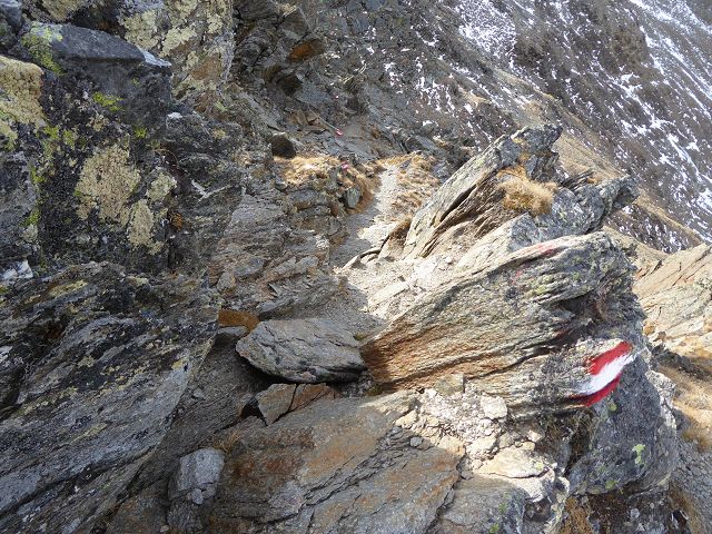 Etwa 150 Höhenmeter weiter unten führt der Pfad östlich Richtung Hochederscharte (ich nenne sie jetzt mal einfach so). Zuerst steil hinauf, dann fallweise in leichter (I) Kletterei, mit Stahlseilen versichert, auf den Grat, der direkt zum Gipfel führt. Der Wind, der noch bis zum Rietzer Grießkogel von eiskalten Temperaturen begleitet wurde, ließ nach.