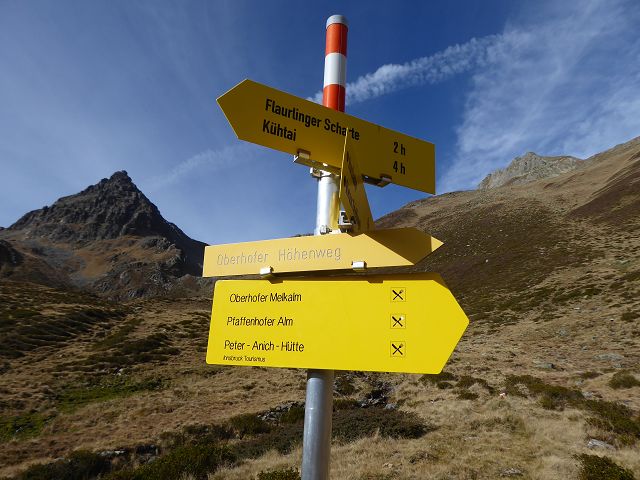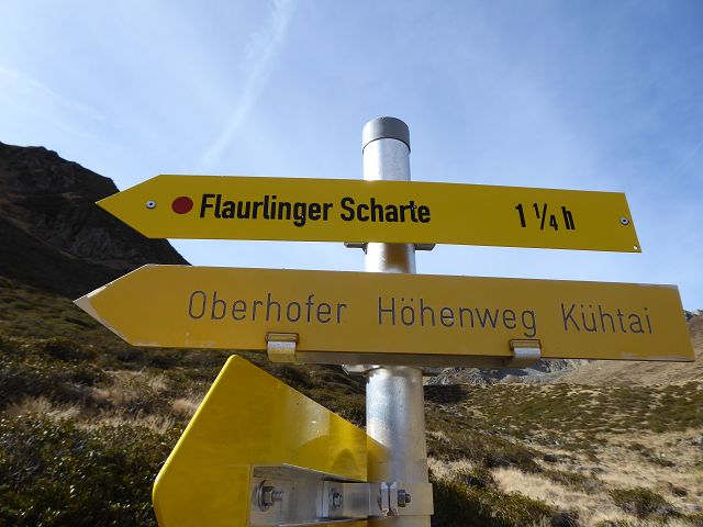 Weiter führte der Weg Richtung Kanzingbach, bis zu einem Abzweig auf etwa 2.100 Meter. Dort bemerkte ich ein „Wegweiserkuriosum“ (wenn auch nur ein unbedeutendes). Der erste Wegweiser zeigte einen Zeitaufwand bis zur Flaurlinger Scharte von 2h. 50 Meter daneben wusste das nächste Metallschild, dass es nur 1:15 Min sein sollen.