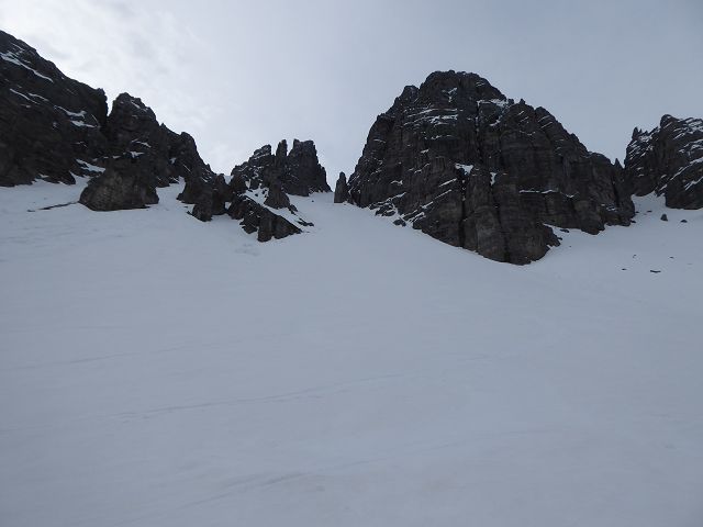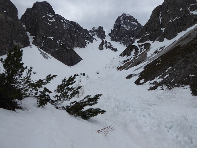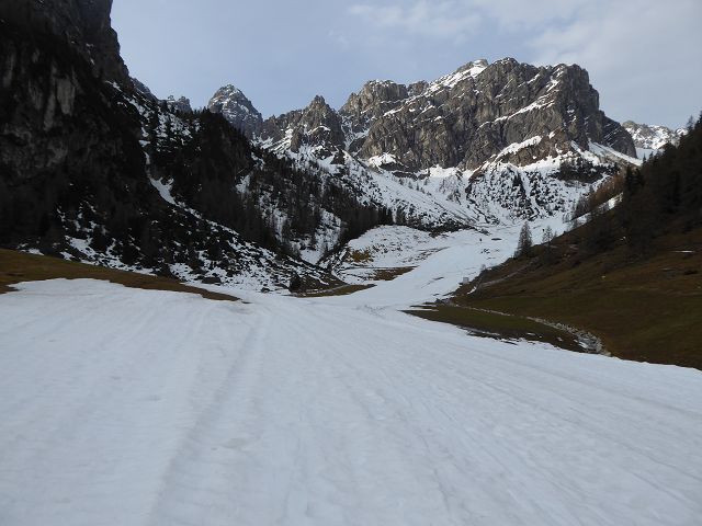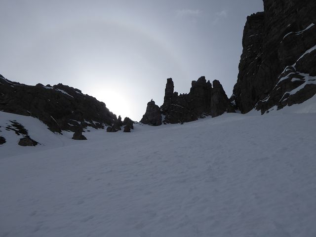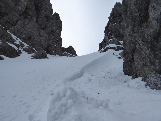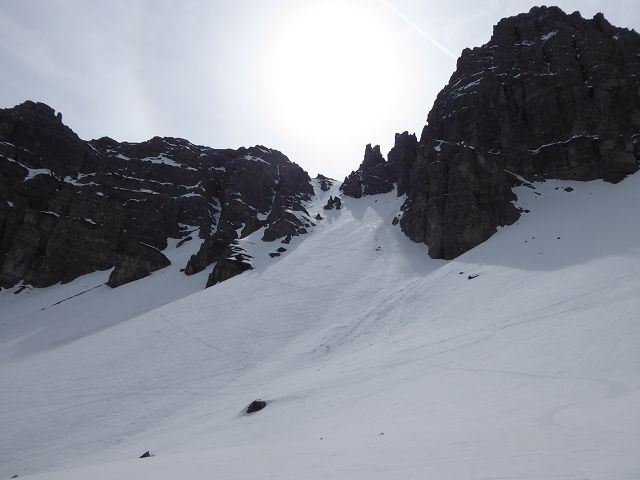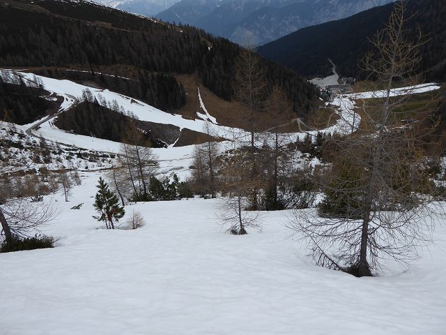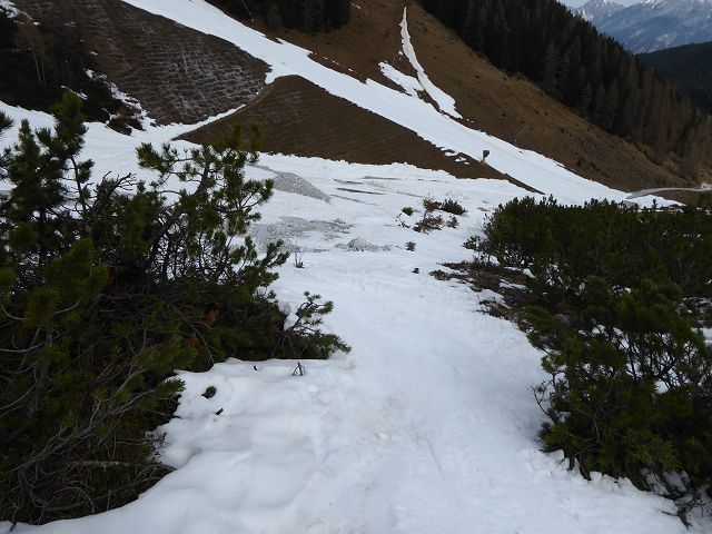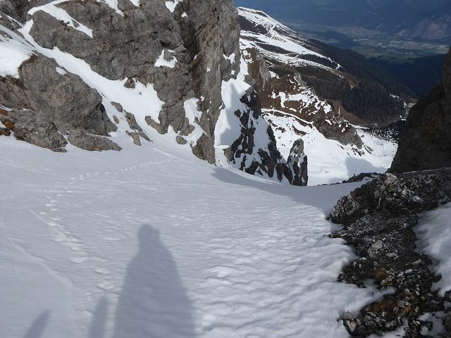 Die Abfahrt gestaltete sich herrlich. Es war eine Mischung aus „Fastfirn“ – der am Vortag weder ganz weich war, noch in der Nacht ganz zufror und hart wurde. Ganz oben und schattseitig konnte man fast von einer wenige cm dicken Pulverschicht reden. Die Scharte zu fahren war ein Traum, unten raus hielt die Schneedecke auch noch und bis zur (leider ruinierten) Piste musste man sich durch die Latschen schlängeln.